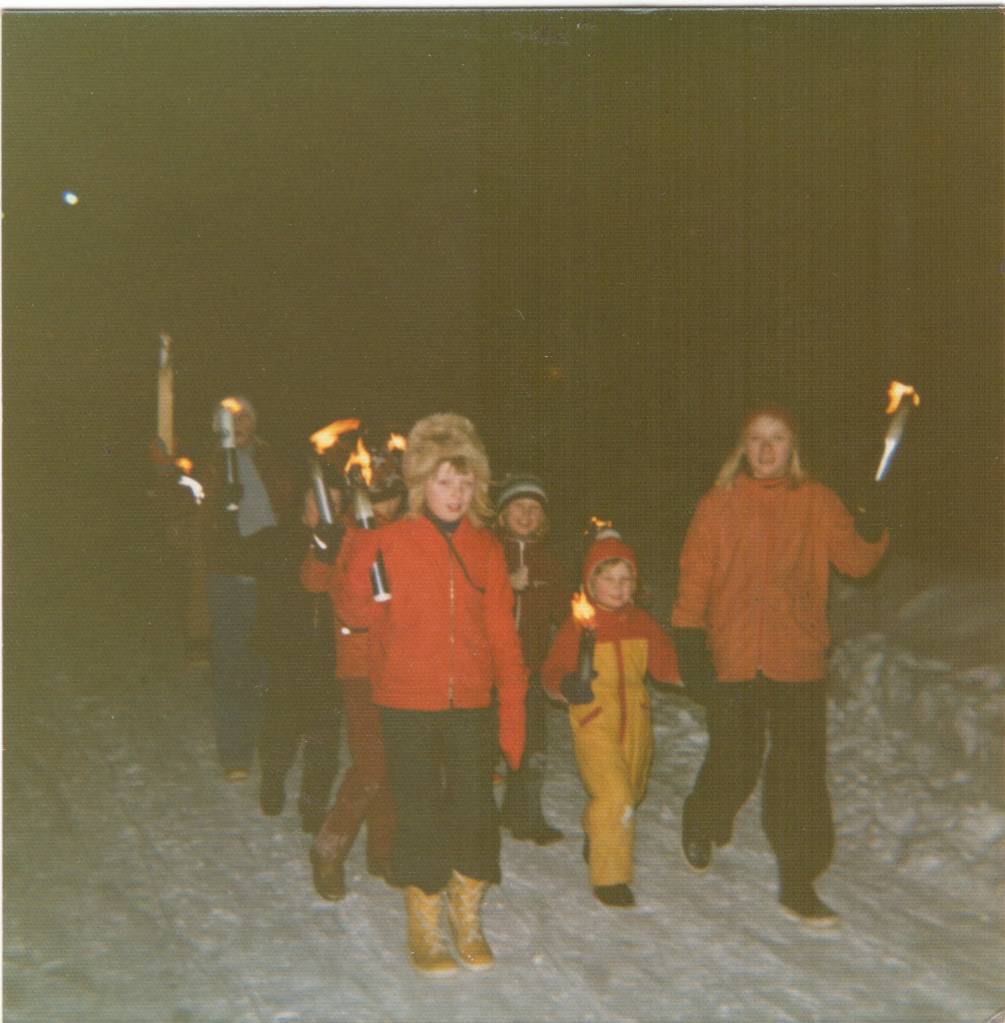 Dette året var det Janne Hermansen og Britt Kjeldsen som organiserte det og vi møtte villig opp. Verneutstyr fantes ikke. Det var bare beskjed om «ikke bruk den nyeste boblejakken», for gnister kunne brenne hull i den. Britt leier på Trine, niesa til Alf-Kondrad Wilhelmsen, da het hun Johansen, i dag Førde, og Alf går bakom. Selv går jeg som nummer tre bak Janne og bak med går Jørn-Petter, men hvem som går foran meg kan jeg ikke se. Det er ikke Gudleif, for han var større enn Jørn-Petter.