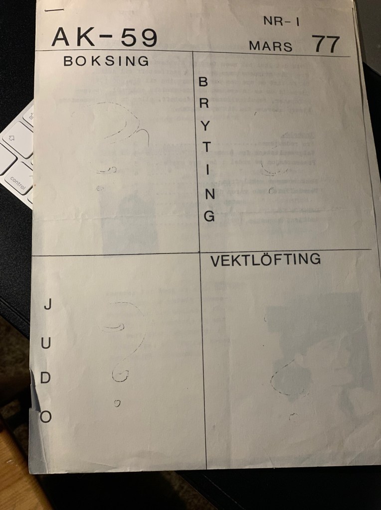 Etter litt leiting i stabelen av gamle prøver, avisutklipp, Billy og prospektkort fra den gangen vi skrev slike, fant jeg beviset mitt. Jeg tok det med opp og holdt det frem slik jeg innbilte meg at en virkelig advokat ville gjøre: «Bevis frue, jeg tilbyr deg bevis». Jeg la ned de fire arkene som var stiftet sammen i venstre hjørne foran henne. Den første og trolig eneste utgaven av klubbavisa for AK-59, utgitt i mars 1977. For alt jeg vet det eneste som fortsatt eksisterer.