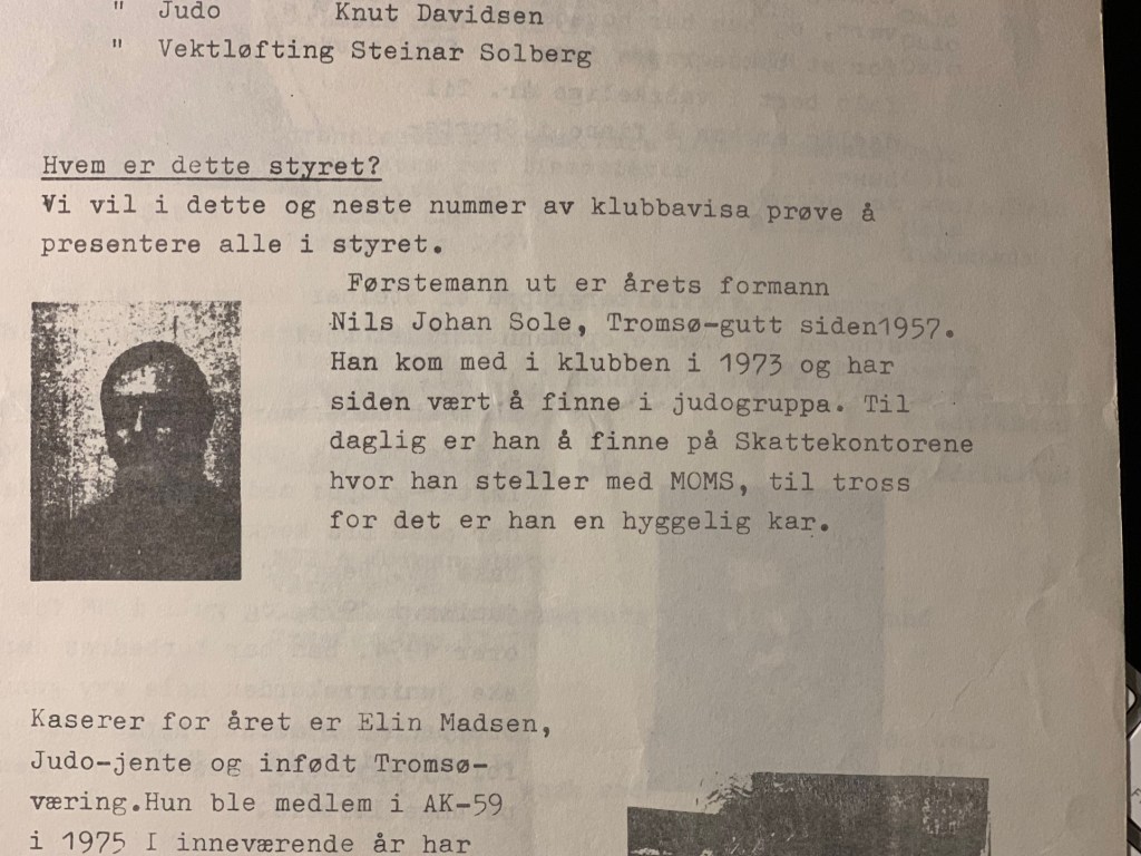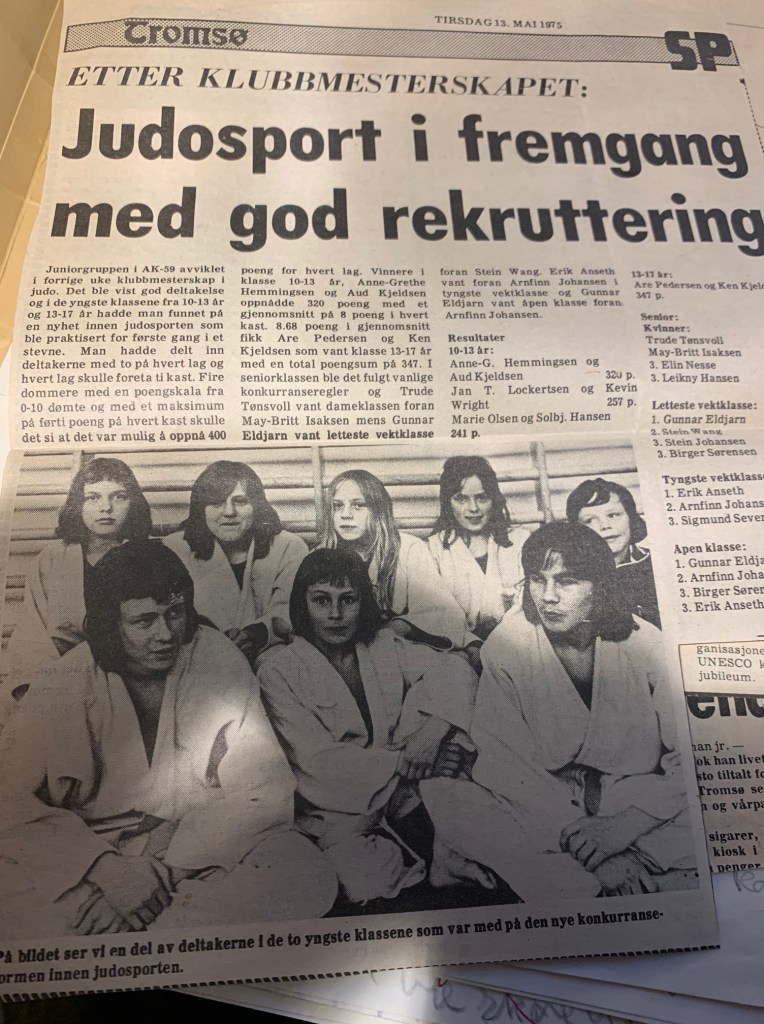 Jeg hadde hørt noen snakke om judo og at mange av ungene i gata var begynt med det. Det var Kjeldsenungene, Ken, Britt og Aud, det var Anne-Grethe Hemmingsen og Janne Hermansen, og så spurte jeg Britt om jeg kunne få være med? Og så kom Roger Nilsen og Kevin Wright fra klassen. Av de voksne var Trude Tønsvoll og Tom Pedersen og Nils Johan Sole. I 1977 var Nils Johan Sole formann. Hun så litt på avisutklippet og klubbavisa. «Det står her at Nils var Tromsø-gutt», sa hun. «Bare tull. Familien kom flyttende fra Nord-Troms og bosatte seg i Fløyvegen», sa jeg før jeg reiste meg og pekte opp mot huset, og så tok jeg like godt og pekte bort på huset der Kjeldsenungene var vokst opp og så Anne-Grethe og Janne.